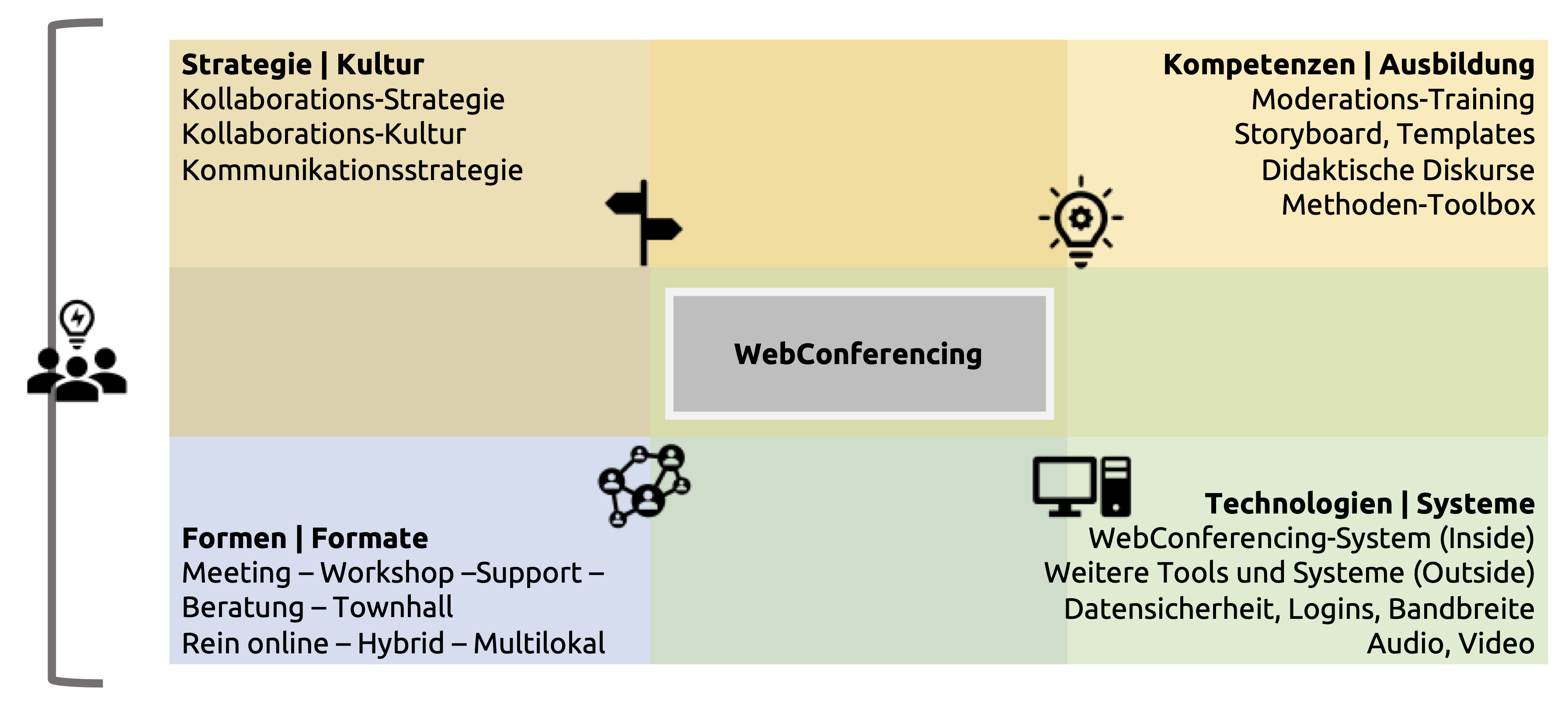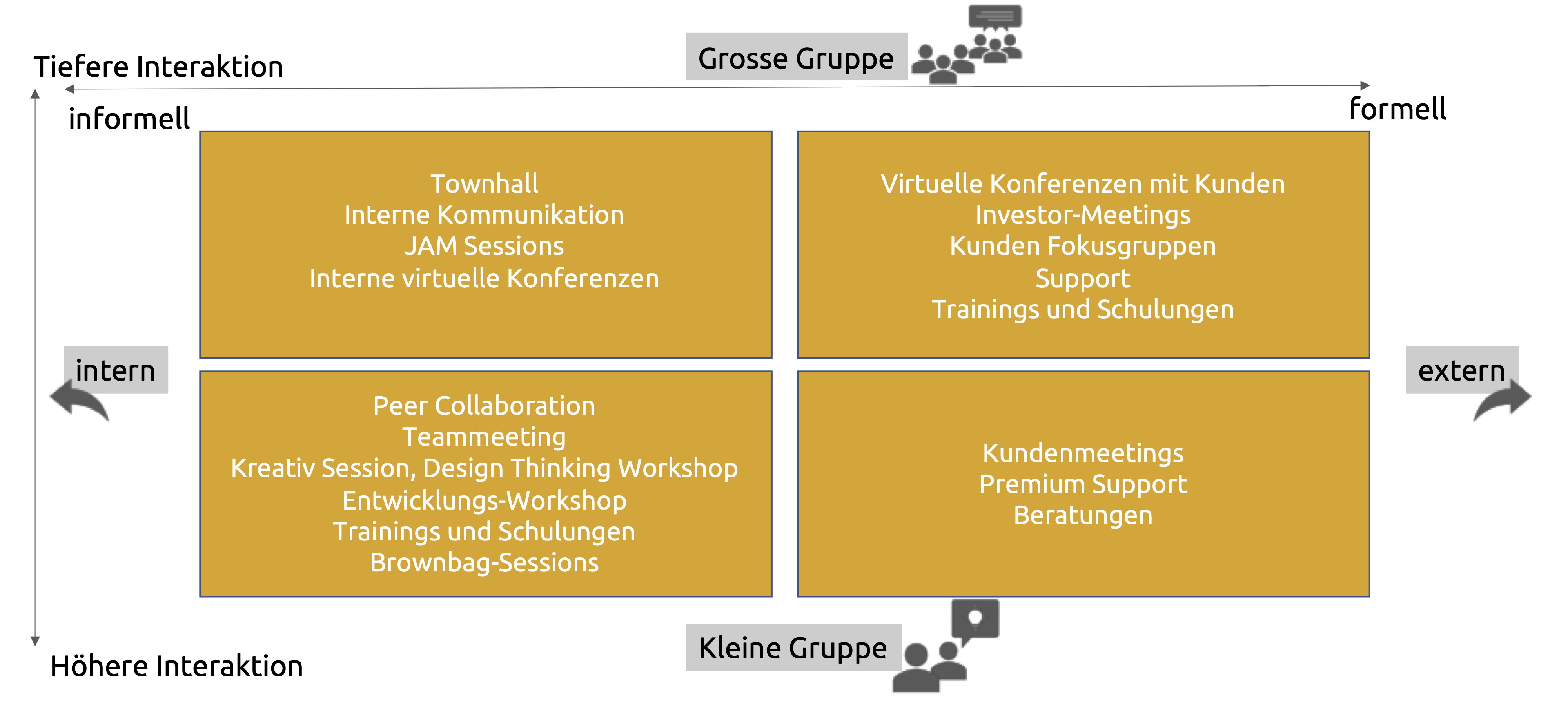 Die vier Quadranten werden durch zwei Achsen unterteilt. Auf der einen Achse wird die Gruppengrösse variiert, auf der andere wird die Spanne zwischen internen und externen Zielgruppen festgelegt. Je grösser die Gruppe ist, desto mehr wird der Grad an direkter Interaktion sein (z.B. weniger Austausch mit allen per Audio und Kamera). Je mehr eine Zielgruppe aus unternehmens-externen Personen besteht, desto formeller sollte das WebConferencing-Meeting gestaltet werden.
